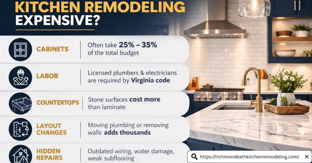 A reasonable and realistic kitchen remodel budget in Richmond, VA is between $25,000 and $50,000 for most homes. Smaller kitchens with cosmetic updates may cost less. Larger kitchens with layout changes or structural work can exceed $60,000.